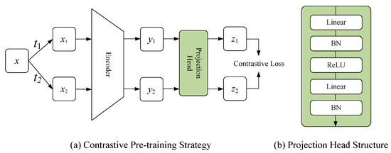 In the pre-training stage, a contrastive pre-training strategy was proposed. Specifically, this strategy contained a positive and negative pairs constructing method and a contrastive representation learning system, as illustrated in Figure 3a.