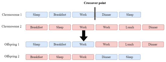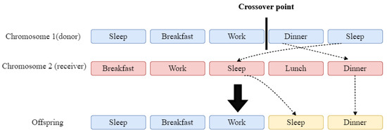 One-point crossover on two individuals representing daily activities sequence of a person.
