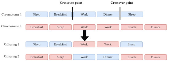 Two-point crossover on two individuals representing daily activities sequence of a person.
