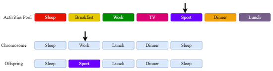 In the case of mutation with random selection, we have generated two numbers, one in range and another one in range . The first number will correspond to the chromosome gene that will be replaced, and the second number will correspond to the selected activity from the activity pool that will replace the gene. Figure 6 presents an example of applying a mutation operator with random selection. The two arrows point to the randomly selected activities. As you can see, the gene inside the chromosome will be replaced by a gene from the activity pool.