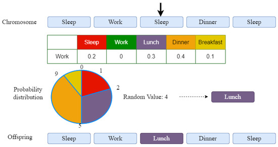 The mutation with weighted selection is similar, but the selection of the new activity to replace the gene is controlled. Once we have selected a gene to be replaced (see Figure 7), we will look at the transition probabilities of the gene before it. As we can see in the example in Figure 5, the activity (i.e., gene) selected to be replaced is “Sleep”, which is preceded by the activity “Work”. To identify the activity that will replace the “Sleep” activity, we will use the values of the transition probabilities of the “Work” activity. We represent the distribution of the “Work” activity transition probabilities in a pie chart where the width of the sectors is proportional to the transition probabilities from “Work” activity to another activity. Based on this pie chart, the selection of the activity that will replace the “Sleep” activity will be performed similarly to the roulette wheel selection method. In our example, the activities that are more likely to follow the “Work” activity (that is, those for which the transition probabilities have higher values) will have a higher chance of replacing the “Sleep” activity. The improvements this method brings over the previous one, is that mutated chromosomes will be more likely to have a higher fitness than the original chromosomes.