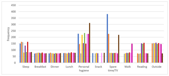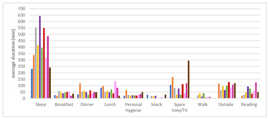 The sleep activity has the longest average duration for all the persons in the dataset and the frequency of occurrence of breakfast, lunch, and dinner activities has a high degree of similarity for all the persons in the dataset. Higher differences in the frequency of occurrence are observed in the case of sleep, personal hygiene, or spare time/TV and reading activities. Moreover, there are persons with missing activities such as snacks, walking, reading, or outside. This is due either to the fact that the sensor did not record that activity, or because the person did not do that activity.