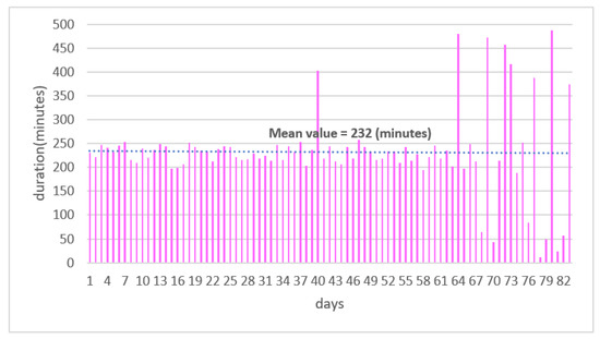 To incorporate time-related information (e.g., duration of the activity) into the detected patterns of activities, we proposed an approach that measures the dispersion of the time values of the duration of an activity around the average value for each period of the day, namely for morning (between 6:01 a.m. and 12 p.m.), for afternoon (between 12:01 p.m. and 18 p.m.), for evening (between 18:01 p.m. and 0:00 a.m.), and for night (between 0:01 a.m. and 6:00 a.m.). To compute the lower and upper bounds of the interval corresponding to the duration of the activity is carried out, the standard deviation is determined as:
