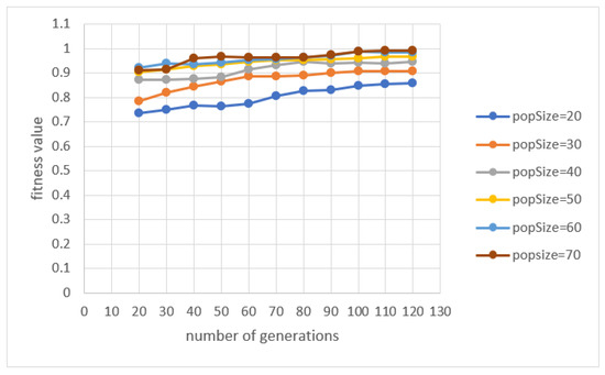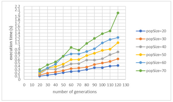 First, we maintained the population size at a constant value and varied the number of generations between 20 and 120. Then, we repeated this experiment for a population size varying between 20 and 70. For each considered configuration, 30 runs were made to compute the average values for fitness and execution time. As shown in Figure 12, with the increase in the population size, an improvement in the fitness value is achieved but also increases the execution time (see Figure 13). The trend is similar when the size of the population is maintained constant and the number of generations is increased (i.e., the value of the fitness and the execution time increase). In the case of fitness evolution, at some point, the increase in the value of fitness stabilizes and does not change for many generations, while in the case of the execution time, the growth is proportional to the number of generations.