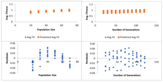 The analysis of variance, ANOVA table, (see Table 5) provides information about the variability level of our regression model reflected by several components. At the same time, Figure 14 shows details of the spread and distribution of the results achieved on how the control variables of population size and the number of generations influence the value of the fitness function. The residuals show the difference of the mean sample (i.e., positive when the value is greater and negative when the value is smaller). The degree of freedom, df, is associated with the variance sources, while the sum of squares SS provides information about data dispersion, and how well the data fits into the regression model. As can be seen in our case the value of the residual SS is lower compared to the total SS, indicating that the model fits well the data. The mean squares parameter, MS, provides an estimate of the variance concerning the regression and is calculated as the ratio between the sum of squares and the degree of freedom. It is used to determine the F value which provides information about the fitness model’s importance in relation to the null hypothesis. Significance F shows if our solution with the two independent variables (that is, the population size and the number of generations) can be used to explain the variability of the fitness value. Since in our case, the value of Significance F is lower than 0.05 the model is statistically significant.