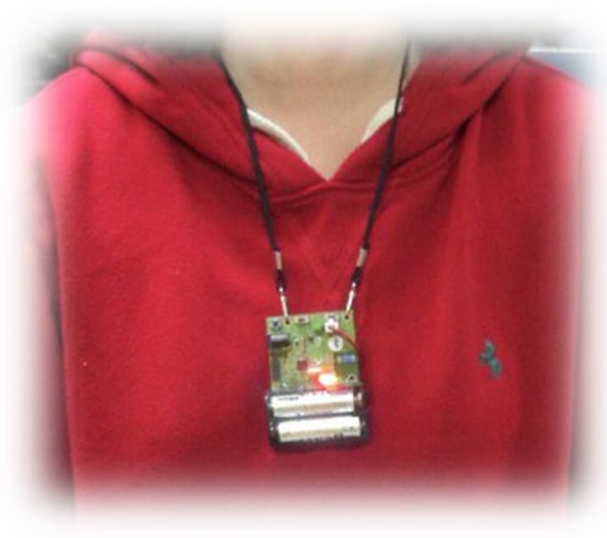 A fall-detection system which can classify falls and ADLs of a person by applying a parameterized dataset to STM-HMM has recently been reported [17]. The dataset was acquired from a self-developed embedded edge device that was attached as a pendant to the participant’s neck and was used as sensor node [17]. The device consists of a ±8 g 3-axial accelerometer (BMA150, Bosch) and Zigbee wireless communication module (CC2430, Texas Instrument). A gateway was used to collect data from multiple wireless sensor nodes. A server was used to classify falls and ADLs by applying the parameters calculated from the 3-axial acceleration data to the proposed fall-detection algorithm. Figure 1 shows a photo of participants wearing the real device for implementing the proposed fall detection system, respectively. A detailed description of this device is described in Ref. [17].