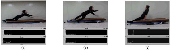 Photos performing 3 types of fall and their measured parameters, sum vector magnitude (SVM) and angle (Theta; θ). (a) Falling forward, (b) Falling sideway, (c) Falling backward.