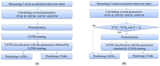 Figure 3a,b show the flow charts of training and test modes of the proposed fall detection system, respectively. In both training and test modes, the data acquired from the edge device are converted into various parameters (see Section 3.2). In the training mode, the converted parameters are normalized, and then all parameters are learned using LSTM. Using the results learned by the LSTM, 3 types of falls and 4 types of ADLs are distinguished. In the test mode, the first possible fall is primarily determined through STM. The STM means that it is determined as a fall event when SVM and θ exceed the thresholds of SVM (SVMth) of 2.5g and θ (θth) of 46.42°, respectively [17]. Then, the first determined fall data are just classified according to 3 types of falls and 4 types of ADLs using LSTM learned in training mode.