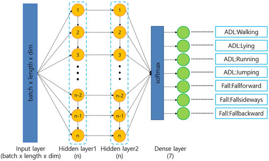 Figure 5 shows the proposed LSTM network for the fall detection. It consists of one input layer, two hidden layers, and dense layer. The input size of the input layer represents batch × length × dimension of data. In the input layer, batch means the number of all input data including falls and ADLs. Because 3-axial accelerometer acquired accelerations as 100 Hz during 5 sec, the length of data consists of 500 by default, and the length can be shortened to 500/sn when sampling with sampling interval sn. In addition, the data dimension is 1, 2, and 5 for single, double, and multiple parameters, respectively. One hidden layer consists of n LSTMs, and the number of hidden nodes (n) in each hidden layer can be changed for performance optimization. The dense layer includes the softmax and optimization, and the output is displayed as 7 result values in the dense layer. The result value is represented using the one hot encoding method.