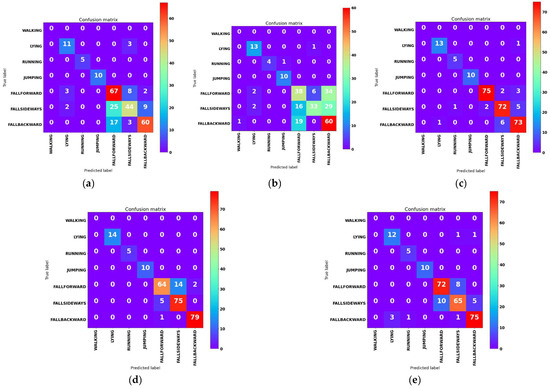 Confusion matrix applying 5-types of single parameter to the proposed LSTM-based fall detection system. (a) Pθ, (b) PS, (c) PD, (d) PG, (e) PGD.