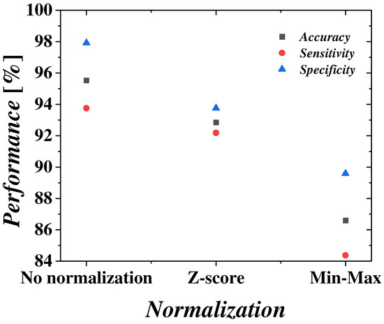 In this section, the impact of different normalization process of the calculated parameters, including No-normalization, Min-Max normalization, and Z-score normalization, is examined. Figure 9 shows the validation data performance of the STM-LSTM-based fall detection system when applying No-normalization, Min-Max normalization, and Z-score normalization. Accuracies applying No-normalization, Min-Max normalization, and Z-score normalization are 95.93%, 92.85%, and 86.6%, respectively. The best performance is shown when no normalization is applied, and the best accuracy, sensitivity, and specificity are 95.93%, 93.75%, and 97.91%, respectively. It showed the worst accuracy when the Min-Max normalization is applied. To investigate the reason why accuracies of the Min-Max or Z-score normalizations are lower than that of No-normalization, time series data of a running pattern and a forward fall pattern before and after the Min-Max or Z-score normalizations are investigated, as shown in Figure 10. In Figure 10, black and red lines denote running and forward fall patterns, respectively. After the Min-Max or Z-score normalizations, the running and forward fall patterns are so similar to each other that it is difficult to easily distinguish them, and thus the accuracies by the Min-Max or Z-score normalizations can be reduced, compared to that of No-normalization.