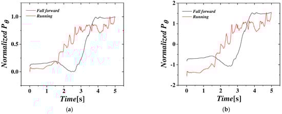 Comparison of data of running and forward fall before and after normalization. (a) min-max normalization, (b) Z-score normalization, (c) No-normalization.