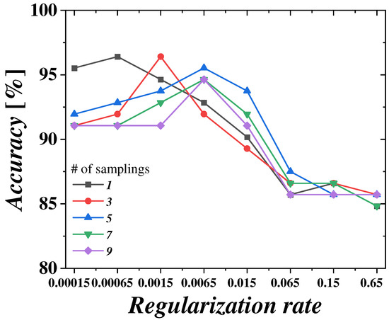 In this section, the impact of different samplings of input parameter and different regularization rates in the STM-LSTM-based fall detection system is examined. Figure 11 shows validation data accuracy vs. regularization rate in the STM-LSTM-based fall detection system with respect to the different sampling intervals of input parameter. The regularization rates are 0.00015, 0.00065, 0.0015, 0.0065, 0.015, 0.065, and 0.15. The black squares, red circles, blue up-triangles, green down-triangles, and purple diamonds denote different sampling intervals of 1, 3, 5, 7, and 9, respectively. Peak values of accuracy of sampling intervals 1, 3, 5, 7, and 9 are 96.42% at λ = 0.00065, 96.42% at λ = 0.0015, 95.53% at λ = 0.0065, 94.64% at λ = 0.0065, and 94.64% at λ = 0.0065, respectively. As the sampling interval increases to 5, the regularization rate at the peak of accuracy increases, but when it is 5 or more, the regularization rate at the peak of accuracy is the same. When the sampling interval increases, the peak values of accuracy decrease. As the sampling interval increases, the length of input data decreases, and thus the noise can be slightly reduced, and the complexity of the input data can be reduced. Therefore, overfitting can occur due to a small number of samples [47]. An excessive increase of sampling interval is more dependent on the simplification of data than the noise reduction, resulting in a decrease in accuracy than an increase in overfitting.