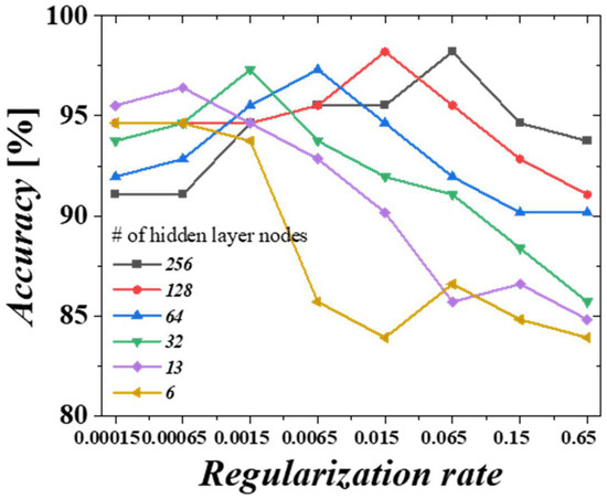 In this section, the impact of different hidden layer nodes and different regularization rates in the STM-LSTM-based fall detection system is examined. Figure 12 shows the validation data accuracy vs. regularization rate of the STM-LSTM-based fall detection system with respect to the different numbers of hidden layer nodes. The regularization rates are 0.00065, 0.0015, 0.0065, 0.015, 0.065, 0.15, and 0.65. The black squares, red circles, blue up-triangles, green down-triangles, purple diamonds, and gold left-triangles denote different numbers of the hidden layer nodes of 6, 13, 32, 64, 128, and 256, respectively. Peak values of accuracy of the numbers of the hidden layer nodes, 6, 13, 32, 64, 128, and 256 are 94.64% at λ = 0.00015, 96.42% at λ = 0.00065, 97.32% at λ = 0.0015, 97.32% at λ = 0.0065, 98.21% at λ = 0.015, and 98.21% at λ = 0.065, respectively. As the number of the hidden layer nodes increases, the regularization rate at the peak of accuracy increases and the peak values of accuracy increase. This means that as the number of hidden layer nodes increases, both accuracy and overfitting can increase due to the increase of network complexity [26,47], and thus the overfitting can be suppressed by increasing the regularization rate [48].