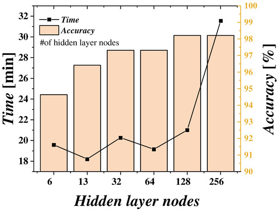 Meanwhile, as the network complexity increases, the training time also increases, and thus it is necessary to efficiently select the number of hidden layer nodes suitable for both higher accuracy and shorter training time. Figure 13 shows the highest validation data accuracy and computation time of the STM-LSTM-based fall detection system with respect to different number of hidden layer nodes. As the number of hidden layer nodes increases, the highest validation data accuracy increases, and computation time increases rapidly at 256 nodes. It showed the same best accuracy in the number of hidden layer nodes of 128 and 256. Accordingly, it can be determined that the number of hidden layer nodes of 128 is most appropriate in terms of accuracy and time.