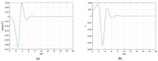 The simulation results show that the system can quickly recover to a stable state, and the system state x = [α, q, θ]T can track the given reference command xc = [αc, qc, θc]T, the derivative of the state variable can eventually tend to 0, and the normal overload Nys tends to 0, which satisfies the control objective. When the system moves longitudinally, the default sideslip angle β = 0, and the selected equilibrium state should ensure that the track inclination angle μ = 0. The simulation results show that the track inclination angle μ is finally stabilized at −0.72 deg, which is slightly different from the ideal state. There is still room for improvement in compensating for parameter perturbation.