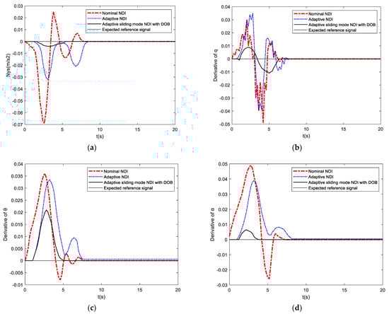 Table 3 is the tracking performance table based on the statistics of Figure 6. In view of the general definition of overshoot, only Figure 6e–g has overshoot [30]. The three controllers in the table represent the three stages of improving NDI in this paper: nominal, adaptive, and adaptive sliding mode.