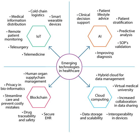 - Jagatheesaperumal, S.K.; Mishra, P.; Moustafa, N.; Chauhan, R. A holistic survey on the use of emerging technologies to provision secure healthcare solutions. Comput. Electr. Eng. 2022, 99, 107691. [Google Scholar] [CrossRef]