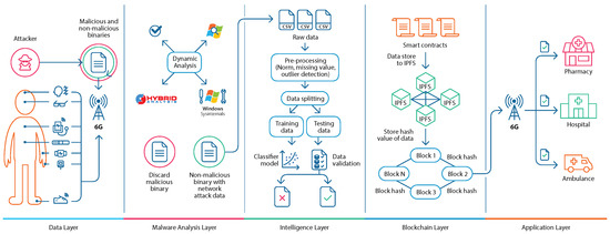 However, AI algorithms cannot deal with data integrity attacks, where an attacker intercepts the communication in order to fetch and inject the malicious code into the legitimate data. In addition, the attacker passively (covertly) listens to the network communication to find sensitive information about the healthcare resources, which includes the number of patients are in critical conditions, what the thresholds of implant devices are, and login credentials of patient information systems [8]. This information is crucial from the security perspective because if the information gets into the wrong hands, severe privacy-related issues can threaten the smart healthcare system. Hence, the researcher has adopted blockchain technology characterised by decentralization, immutability, transparency, and security [9,10]. Pinto et al. in [11] explored the benefits of blockchain technology in the smart healthcare system, as it resolves the issue of data integrity, transparency, and security. They proposed a traceable system for electronic health records, whereby a patient and user can securely exchange their data. They used a private blockchain by implementing it in the HyperLedger Fabric, where two separate databases are maintained for data traceability. Further, the authors in [12] studied the heterogeneity problem of the smart healthcare system resulting from the variety of devices and data formats, which makes data management difficult. To address this issue, the authors presented a blockchain and cloud-based secure and efficient framework for better interoperability in smart healthcare systems. The integration of blockchain with cloud computing reduces the computational cost and increases the security and privacy of the smart healthcare system. Gohar et al. in [12] discusses the benefits of amalgamating blockchain and cloud technology to offer cost-effective and secure data storage of medical data. They proposed a five-tier secure and reliable framework for better interoperability between different healthcare providers. Next, Dhairya et al. in [13] proposed an AI and blockchain-based secure approach to securely transmit securely a patient’s medical data to the medical staff. Firstly, they applied machine learning models to classify malicious data obtained by wearables and remove them from the healthcare systems. Then, they used blockchain technology to store the non-malicious wearable data to confront data integrity attacks. Similarly, the authors of [14] presented a collaborative framework comprising a deep learning model, blockchain, and 6G network interface. In their proposed framework, the predicted data from the deep learning models is stored inside the public blockchain to offer secure data storage. Moreover, the communication between each entity of their proposed framework is provided by the 6G network that offers low latency communication.