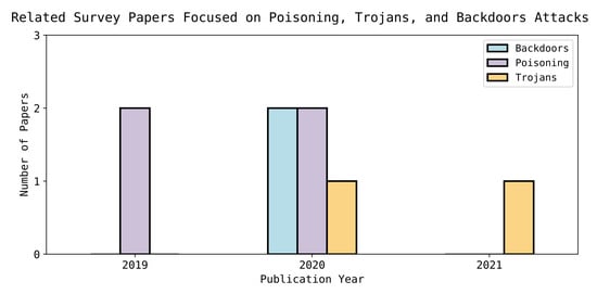 19] briefly reviewed data poisoning attacks (backdoor, and Trojan attacks) and some of the defense methods. They focused on backdoor attacks, and they summarized specific defense proposals (data defense, model defense, and training defense). Although poisoning attacks can violate the integrity or availability of a neural network, they are very hard to defend, and defenses are still in their infancy.