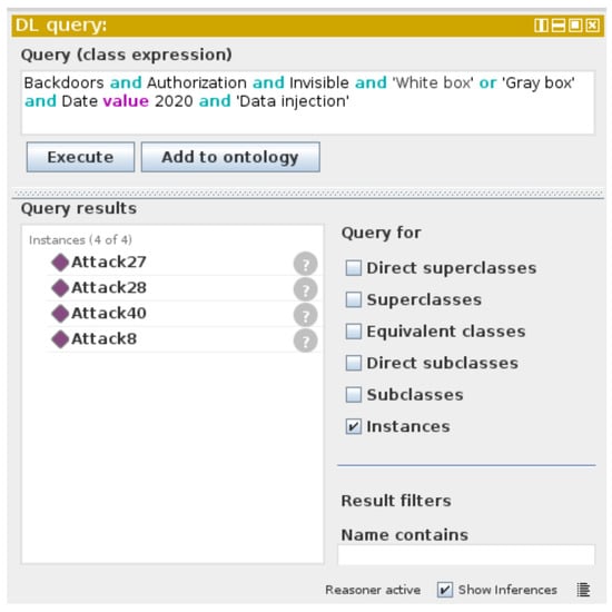 Figure 15 the query was carried out in Protégé by using the DL Query and the HermiT reasoner. It shows Attack8, Attack27, Attack28, and Attack40 as the results of the question of what are the invisible backdoor attacks that violate the authorization of the system and can be injected on the dataset from adversaries in white-box or gray-box scenarios. To restrict the reuse, we select the 2020 published attack; however, more complex queries can be conducted by using SPARQL or the Neo4j database [