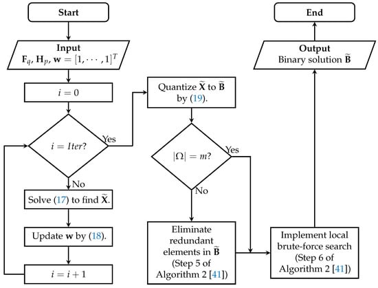 for , and the support set of is denoted by . Note that may contain m or more indices with sufficiently small in (19), which requires an additional step to reduce the number of indices to m. As in Step 5 of Algorithm 2 [41], we eliminate some indices iteratively until m indices remain in , where an index will be eliminated at each iteration if causes the lowest increase in mutual coherence. Finally, we conduct a local brute-force search to maximally reduce the mutual coherence of the Kronecker-product-based frame, which updates by replacing its indices by those in . As in the previous step, the mutual coherence is computed by (16) for the local brute-force search. The whole process to find a subsampling index set for the Kronecker-product-based frame is summarized in Figure 1.
