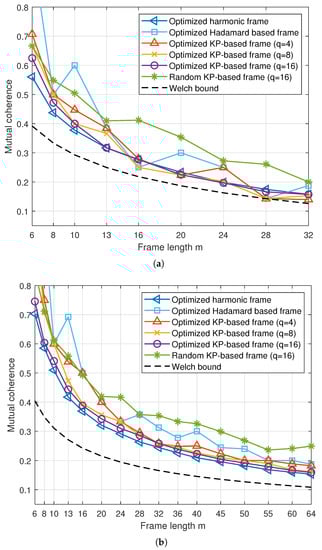 The mutual coherence of various frames over frame length m. (a) , (b) .