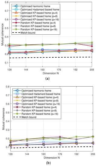 The mutual coherence of various frames over frame dimension N. (a) , (b) .