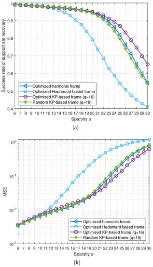 Performance of sparse signal recovery for various frames of and . (a) Success rate of support set recovery, (b) mean squared error (MSE).
