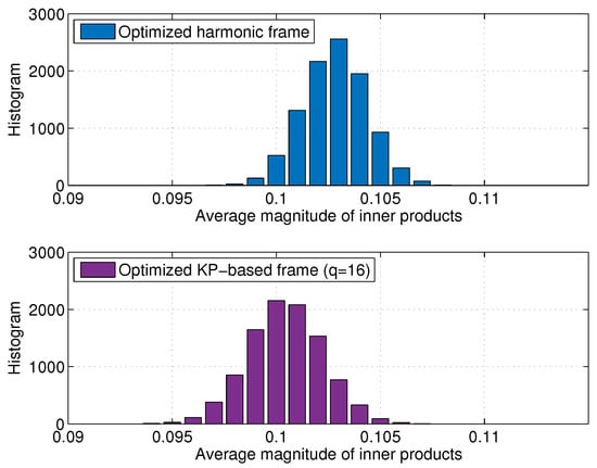 Moreover, if , we observed the optimized Kronecker-product-based frame with achieves better performance of success rate and MSE than the optimized harmonic frame. To investigate this observation, we compare the distributions of the average magnitudes of inner products for randomly selected 30-frame vectors in the optimized harmonic and the optimized Kronecker-product-based frames, respectively. We performed 10,000 random trials of selecting the frame vectors and averaged the inner product magnitudes to sketch the histogram. Figure 5 shows that if 30-frame vectors are selected, the optimized Kronecker-product-based frame tends to have lower inner products on average than the optimized harmonic frame, which implies that OMP will be more likely to detect a support set of 30 non-zero entries in the optimized Kronecker-product-based frame. Because the higher sparsity s requires a larger number of frame vectors to be distinguished, it will be more helpful for CS recovery if the average magnitude of the inner products of a frame is lower. Therefore, Figure 5 demonstrates that the optimized Kronecker-product-based frame is advantageous in high sparsity s.