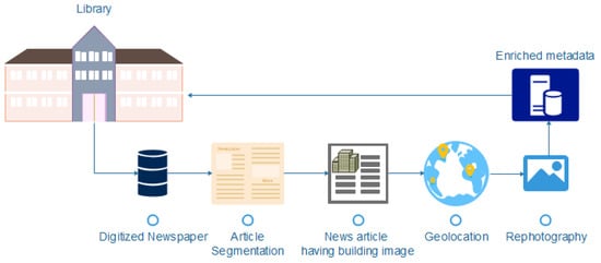 This research study aims for the context-aware querying, geolocalization, and rephotography of historical buildings from the KBR digitized newspaper collections. The overview of the general workflow is shown in Figure 2. The first step to geolocate and rephotograph historical images is to digitize newspaper collections. As a result of OCR, an ALTO/XML file is created that contains all the information on a newspaper page (regions where text/illustrations appear, style, alignment information, a link to a paragraph, and description). The next step is to process the newspaper using a document layout analysis approach to segment the articles. Historical images of the buildings are geolocated based on contextual information from the article and illustration captions. A Google image search is used to find similar images based on image descriptions. The irrelevant images are then filtered out by feature matching algorithms. Finally, images with the same perspective are used to perform the rephotography.