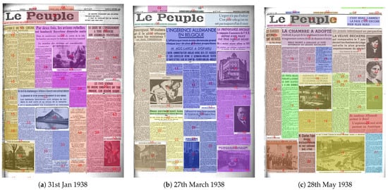 KBR, the Royal Library of Brussels, is the national scientific library of Belgium, responsible for providing access, digitization, and the preservation of all Belgian publications. The library holds over 7 million documents, including newspapers, magazines, books, manuscripts, music, maps, and catalogs [34]. The library not only secures all historical records, but also provides digital access to cultural heritage content to enable historical research. The historical newspaper collection at KBR includes more than 2000 Belgian and 500 international publications. Digitizing and making the historical newspaper collection of KBR accessible has been a long-term project over the last decade [35]. For this study, we used front-page news from the French language socialist newspaper Le Peuple from 1938.