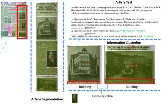 In the next step, we extracted only the articles that contained images of a building. We could achieve this using an image classification algorithm. Using historical images, we trained a deep learning algorithm to extract building objects from the historical images. Figure 4 shows how the article text associated with a detected building image is extracted and passed on to the next step for caption detection. To evaluate the proposed approach, we measured the F1 score. We found that the F1 score of the newspaper article segmentation was 0.76.