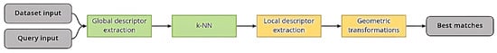 In computer vision, images are often described as vectors or descriptors that represent the task-specific, distinguishable characteristics of an image. These vectors can be extracted by a variety of different algorithms. In the past, features were extracted manually based on the task. Later, computer vision approaches enabled the extraction of general features such as SIFT [60], SURF [61], or ORB [62]. Nowadays, as deep learning is popular in computer vision domain, convolutional neural networks (CNN) are trained for the identification and feature extraction of specific objects, such as buildings [63,64]. These architectures are typically designed for image classification but can also be adapted for feature extraction. They often have a high-dimensional vector as output which can be reduced to the desired dimension using dimensionality reduction techniques such as a principal component analysis (PCA) [65]. Some models are trained on images of landmarks and buildings to detect distinguishable features between buildings. A currently popular CNN model for feature extraction was published by Radenović et al. [64] under the name Cirtorch. It is a fine-tuned ResNet101 [66] designed for feature extraction from images on which buildings and landmarks are mapped. This model extracts one vector per image, a global descriptor. Other approaches extract the most important keypoints of an image and describe these points in separate vectors, the local descriptors.