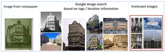 The final step was geolocalization, which is a two-step procedure. In the first step, we searched for relevant images using a Google image search based on the location information, extracted from the caption. For each image, we extracted the top 10 results. The Google search gave all correct results when we searched for well-known landmarks, e.g., “the Castle of Prague”, but in the case of a less common landmark, the Google search results always returned some irrelevant images, e.g., the search result of “Femmes Prévoyantes du Centre, Nieuport Bains” shows only two correct results for the mentioned building. This study aimed to be able to geolocate less-common images of buildings in addition to the well-known landmarks. Therefore, in the second step, we needed to filter the search results by keywords to find out which images were similar to the image shown in the newspaper. Our pipeline for finding the best matches is shown in Figure 5. We computed the features of all images and compared the similarity score. Using a threshold, we filtered out the irrelevant results.