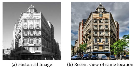 The next step after geolocalization is an attractive visualization of historical content. For this purpose, we chose the computer-aided rephotography of historical images to show the time travel between two different timestamps of a given location. As the name implies, rephotography is the process of recapturing a photograph from the same point of view [28]. Rephotography is valuable for comparing historical versus recent architectural heritage-related visual material [29]. Performing rephotography on historical images is notoriously difficult due to the quality of such collections and is usually carried out manually or semiautomatically. Visualizing the temporal evolution in one image can enable humanities scholars to study and analyze changes in a location over time. Some examples of manual rephotography are shown in Figure 1.