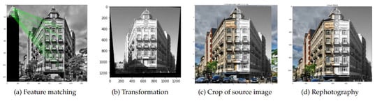 Rephotography is of great value for research in historical studies because it tracks changes over time. In the past, historical scenes were rephotographed manually [70]. Manual rephotography is complex and requires special photographic skills and time to achieve good results. A good rephotograph depends on the precise location, angle, and perspective from which the historical image was taken. Therefore, recapturing a historical scene from the same perspective has been challenging. Computer vision research enables many assisting applications [28] that help the photographer to capture the image from the same viewpoint. Besides these applications, many approaches have been proposed to achieve rephotography based on image collections [71]. The advances in computer technology allow researchers to address this problem using deep learning [29]. The approach of extracting the facade and performing rephotography works well for images of houses where the facade is prominent, but detecting the facade of complex building structures makes this task even more difficult. By using computer vision techniques such as SIFT, ORF, SURF, Cirtorch, or DELF we can solve the problem to some extent, but improvements are still needed to learn and match features from low-quality historical images.