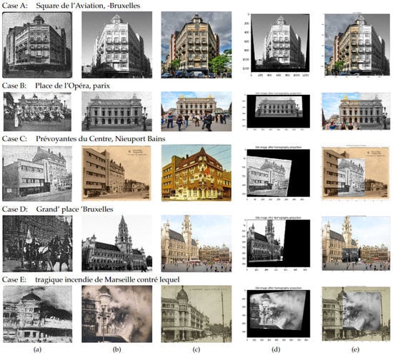 Furthermore, this section discusses the cases we encountered during our research using the proposed workflow. Figure 9 shows the results of our complete workflow to geolocalize and visualize the historical collections of KBR. In this section, we discuss eight different cases. In case A, B, C, D, and E, it can be clearly seen that the extracted images matched very well with the reference historical images. The feature matching pipeline could detect good features, resulting in astonishing transformation and rephotography.