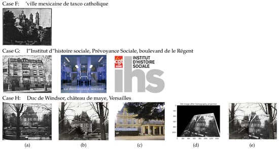 Some false cases (case F, G, and H) are also shown in Figure 10. Case F “’wsi. [ mexicaine de taxco catholique]” failed to detect similar buildings because of the poor quality of the OCR results. In this case, the caption tags detected using OCR were “•3?HH - **?*. /- wsi.: .. . .CTagfigaj *•****»: ”, which made it impossible to extract the correct location “ville mexicaine de taxco catholique” from the caption. Hence, if the OCR is of poor quality, the location information extraction algorithm is not be able to detect the correct location. This makes it impossible to proceed with the geolocalization and rephotography steps. In addition, the proposed method may fail if we perform a keyword search and cannot locate a matching building image. Case G “l”Institut d”histoire sociale, Prévoyance Sociale, boulevard de le Régent” shows that the text detection was good, but no matching building was found to proceed with the geolocalization and rephotography steps.