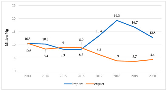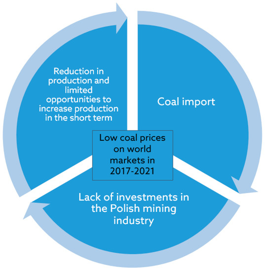 Poland, despite one of the largest hard-coal deposits (total proved reserves at end of 2020) in Europe (22.53 billion Mg) [1], has become its importer since 2017 (Figure 1). This was caused by increasingly difficult exploitation conditions (deep underground mines with many natural hazards), gradual withdrawal from hard coal in the energy industry and the availability of cheap raw material, mainly from Russia. The diagram of the couplings that occurred in the above-mentioned range is presented in Figure 2.