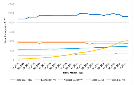 According to data from Energy Market Agency (ARE) [2], at the end of June 2022 (Figure 3) the total installed capacity in PV amounted to 10.36 GWp (an increase year by year over 93%) and in wind energy 7.48 GWp (an increase every year by 11.7%). In the period of January 2019–June 2022, photovoltaics recorded the largest increase in installed capacity among all electricity generation technologies in Poland (by over 1600%).