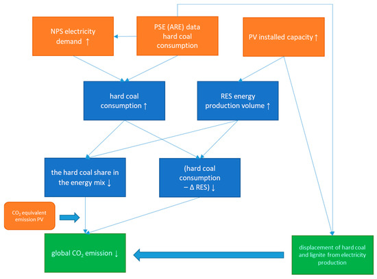 The conducted analysis is based on the historical similarity of the replacement of conventional (carbon) sources by PV by determining in how many cases (%) a specific carbon source will be replaced (Figure 4). It will also allow determination of the reduction of CO2 emissions within the National Power System (NPS) and the demand for hard coal. In the case of demand exceeding the domestic production, the analysis will allow determination of the volume of imports.