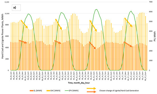 To estimate the change in the profile of electricity generation by renewable energy sources (in that case PV) of specific conventional sources, coefficients for replacing the volume of electricity production in lignite and hard-coal power plants were introduced into the methodology (Equations (5) and (6)).