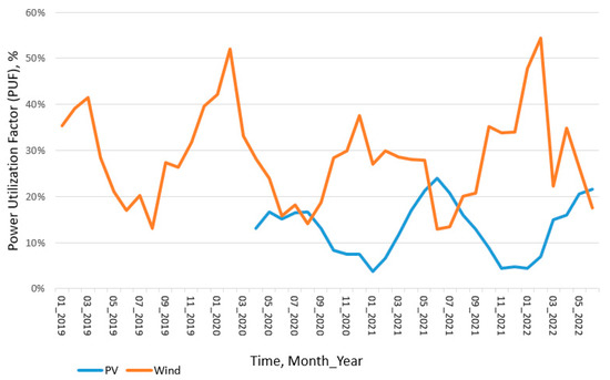 The chart below (Figure 7) shows the installed capacity utilization factor (PUF, Equation (2)) in photovoltaics and wind turbines in 2019–2022, with data for photovoltaics from April 2020 to June 2022.