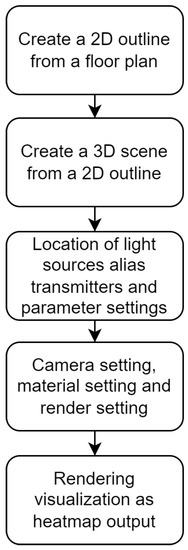 For the design principle of this method, a combination of two tools is chosen. The SketchUp Pro 2021 software tool allows the creation of a 3D model of the indoor environment. The advanced multi-core ray tracing engine called V-Ray is a plugin of SketchUp Pro, which uses the ray tracing (graphical) method. This combination allows the entire simulation to be created in one framework. That is, creating a 3D scene based on the floor plan, setting up sub-components for the heat map simulation, such as materials or lights, and rendering the final heat map output on the layer of floor plans with the corresponding RSSI values. The complete process of creating a 3D scene up to heat map generation is shown in Figure 1 and is explained in detail in Section 2.1, Section 2.2, Section 2.3, Section 2.4, Section 2.5, Section 2.6, Section 2.7 and Section 2.8.