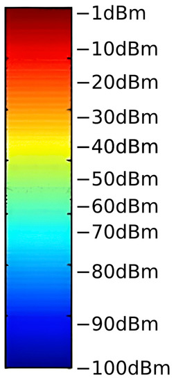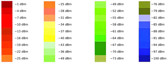 A smooth color spectrum of RSSI values shown in Figure 12 is loaded into the script based on the RSSI values from the I-Prop tool, Figure 6. A set of color ranges corresponding to the ranges of RSSI values is then created. The script then detects the color of each pixel and assigns it to a color range of RSSI values. The result is the percentage representation of each RSSI value or range of RSSI values from both heat maps, i.e., simulated and original. White, black and grayscale colors are not considered RSSI values and are excluded from the detection. From the original RSSI gradient values shown in Figure 6, it can be seen that the color ranges for −1 to −20 dBm are considered to be red. The shades of blue are considered equal in the −80 to −100 dBm range. The shades of green are found in the −40 to −60 dBm range, and thus, this fine differentiation disappears for this reason, the classification of the ranges is proceeded with: