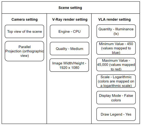 The rendering settings are configured to generate a heat map, and the processor is selected as the computational unit. It is common today to use a graphics processor to render computer graphics, but the VLA renderer does not currently support this option. The details of each setting can be seen in Figure 9.