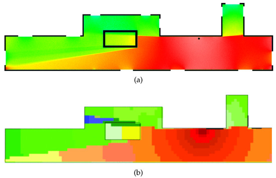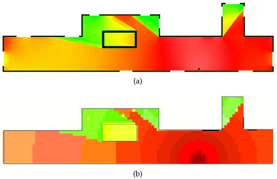 The results of the RTg method, i.e., the simulated heat map shown in Figure 10a and Figure 11a, are compared with the empirical Multi-Wall method, i.e., the original heat map shown in Figure 10a and Figure 11b. The comparison is performed by the Python script [39]. The input of this script is the original and the generated heat map, but it is mandatory to unify the orientation and resolution of both heat maps. RTg and the VLA renderer used allows for the generation of heat maps with a smooth color spectrum of RSSI values, see Figure 10a and Figure 11a, which is desirable in the case of more accurate coverage prediction in units of RSSI values. In the case of the comparative heat map; see Figure 10b and Figure 11b, the resolution of RSSI values is not as fine. This is taken into account in the comparison of the simulated heat maps.
