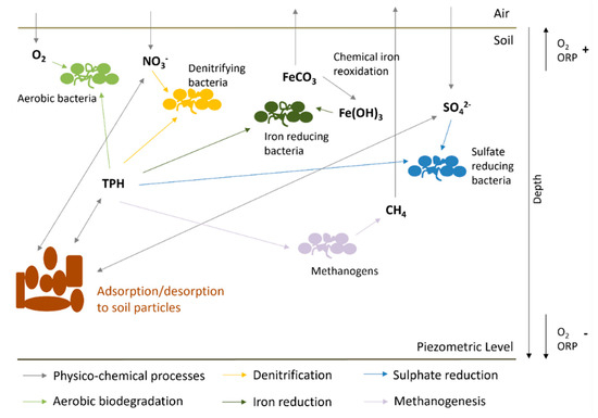 To date, several physical and chemical remediation technologies are available (e.g., physical removal, soil washing and oxidation/reduction via chemical agents) [5,6]; however, there is an increasing willingness for the use of less aggressive and more eco-friendly techniques, such as bioremediation [7,8]. Critical factors in bioremediation are the availability of nutrients and electron acceptors (oxygen, nitrate, iron (III), sulfate) as well as the existence of microbial catabolic activity towards hydrocarbons [3,9,10]. Bioavailability of the contaminants also influences microbial activity, since the access of the microorganisms or their enzymes to the compounds can be hampered due to hydrocarbon interactions with the organic carbon content of the soil [3]. These aspects are particularly important when hydrocarbon contamination occurs in depth; for example, due to leaking underground storage tanks or pipelines. In permeable soils, the plume can penetrate to a significant depth, hindering the contamination removal and site decontamination [11].