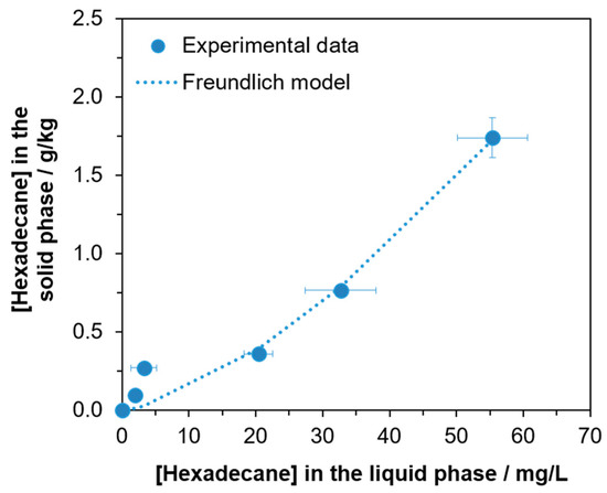 In Figure 2, the distribution of hexadecane concentration between solid and liquid matrices is presented, highlighting once more the tendency of hexadecane for partitioning into the soil. The experimental results were adjusted to a Freundlich isotherm (Equation (2)) [49]. This equation is used here to describe the distribution of hexadecane in the soil (solid phase) versus in the liquid (aqueous and non- aqueous) phase. In this experiment,